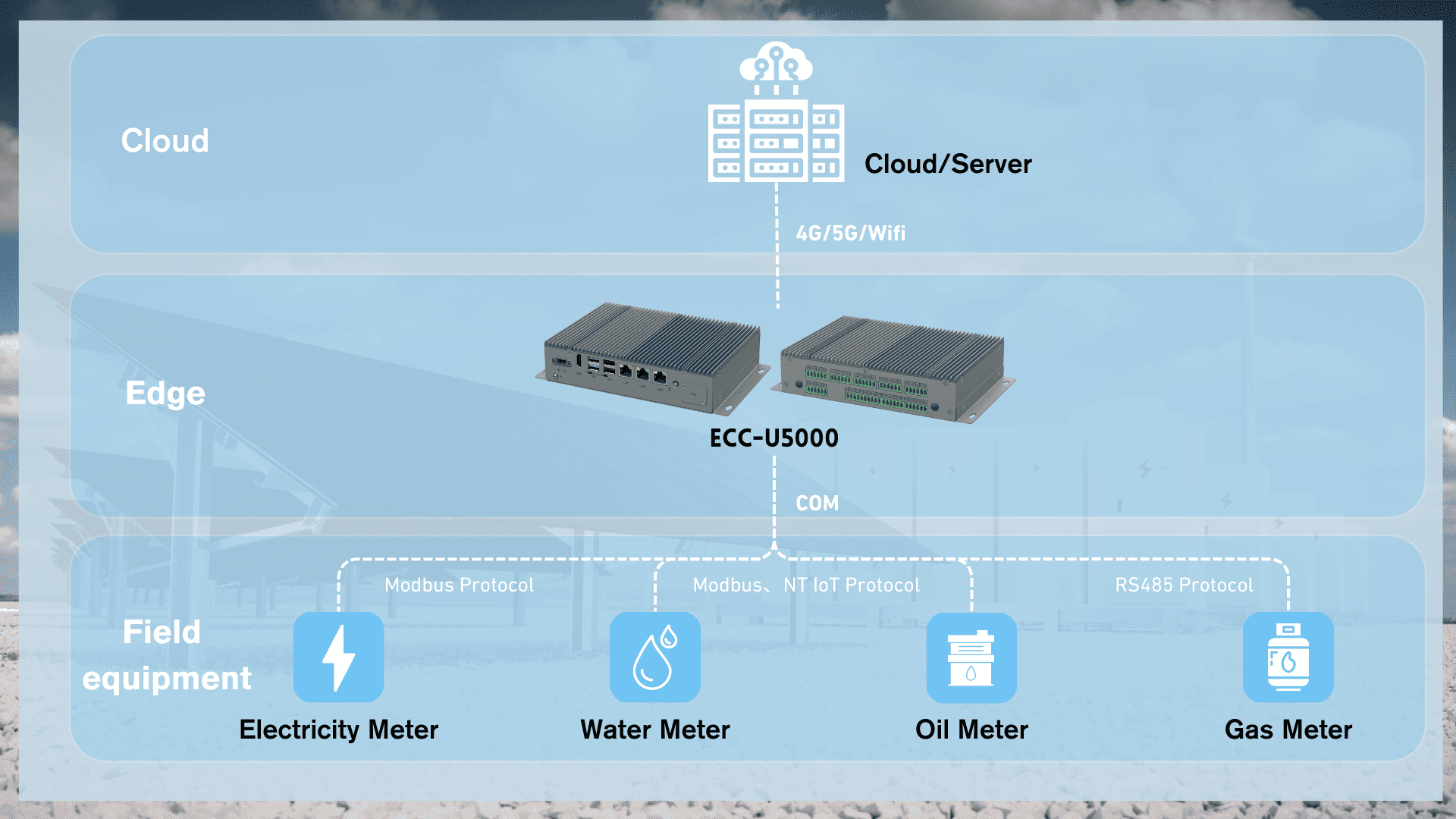 In response to the above requirements, JHCTECH offers the ECC-U5000 energy controller, equipped with Intel® Elkhart Lake Soc CPU, for this solution. On the one hand, it directly handles data collection and analysis for the energy monitoring system, while on the other hand, it also monitors faults and anomalies during operation, playing a critical role in promptly protecting equipment and ensuring safety.