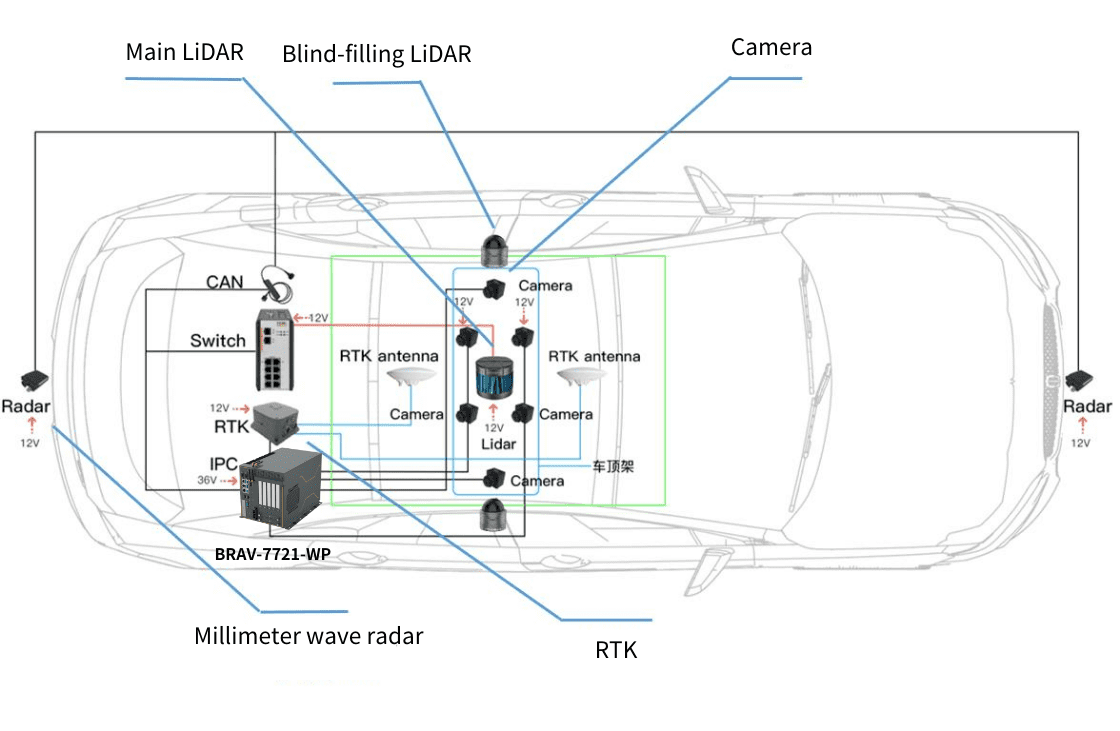 The vehicle-mounted solution deployed lidar, millimeter-wave radar, vehicle-mounted cameras, PTP time synchronization module, RTK inertial navigation, and vehicle-mounted Ethernet switches. JHCTECH's BRAV-7721-WP undertakes important tasks such as recording vehicle sensor data, real-time data playback, and data verification.